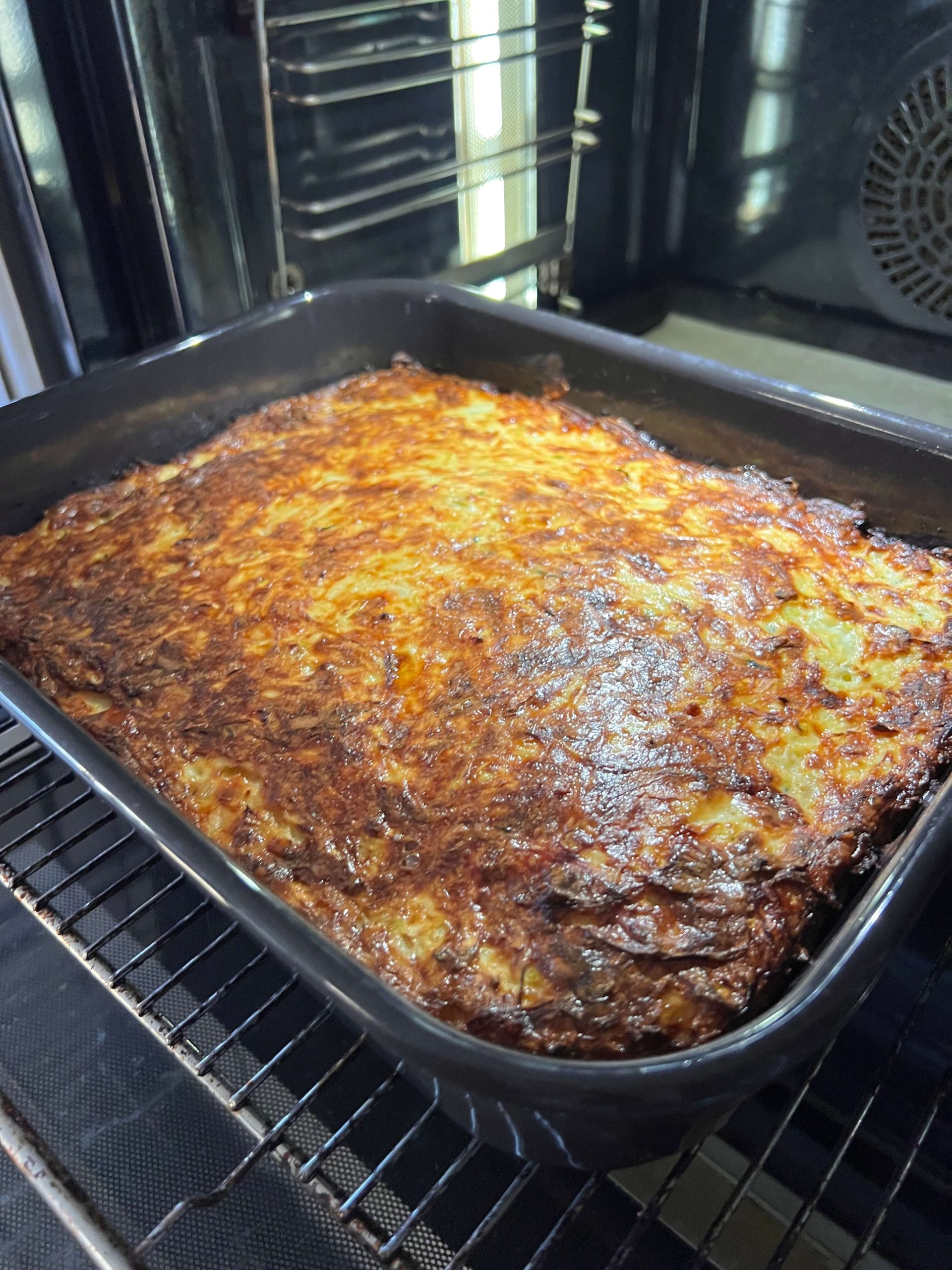 Svarbu, gerai nusunkti vandenį nuo cukinijų, kad ji neplūduriuotų. Kadangi mes mėgstame traškią plutelę (ir kuo jos daugiau) naudojau nemažą kepimo formą, kurioje pats cukinijų kūgelis išėjo vos 5-6 cm aukščio. Jeigu mėgstate „šlapesnį vidų”, naudokite mažesnę skardą. Tiesa, kepimo laikas gali šiek tiek skirtis, nors reiktų pamėginti, gal ir ne.