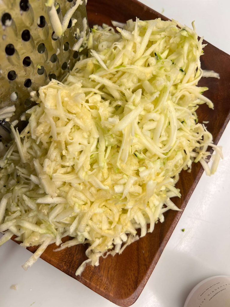 Nuo cukinijų “nugręžiu” skystį, sumaišau su visais ingredientais ir supilu į aliejumi išteptą kepimo formą.