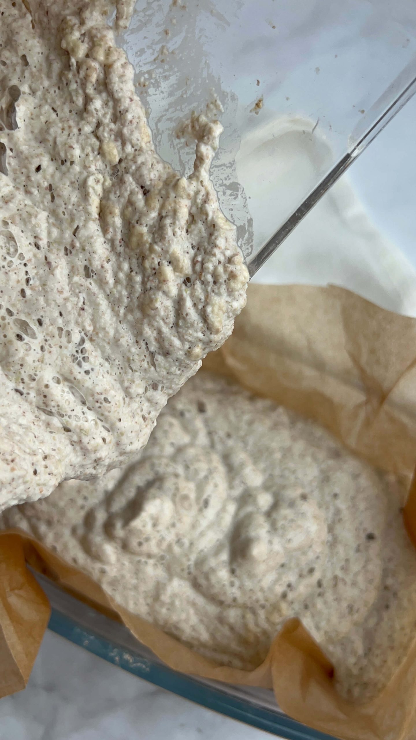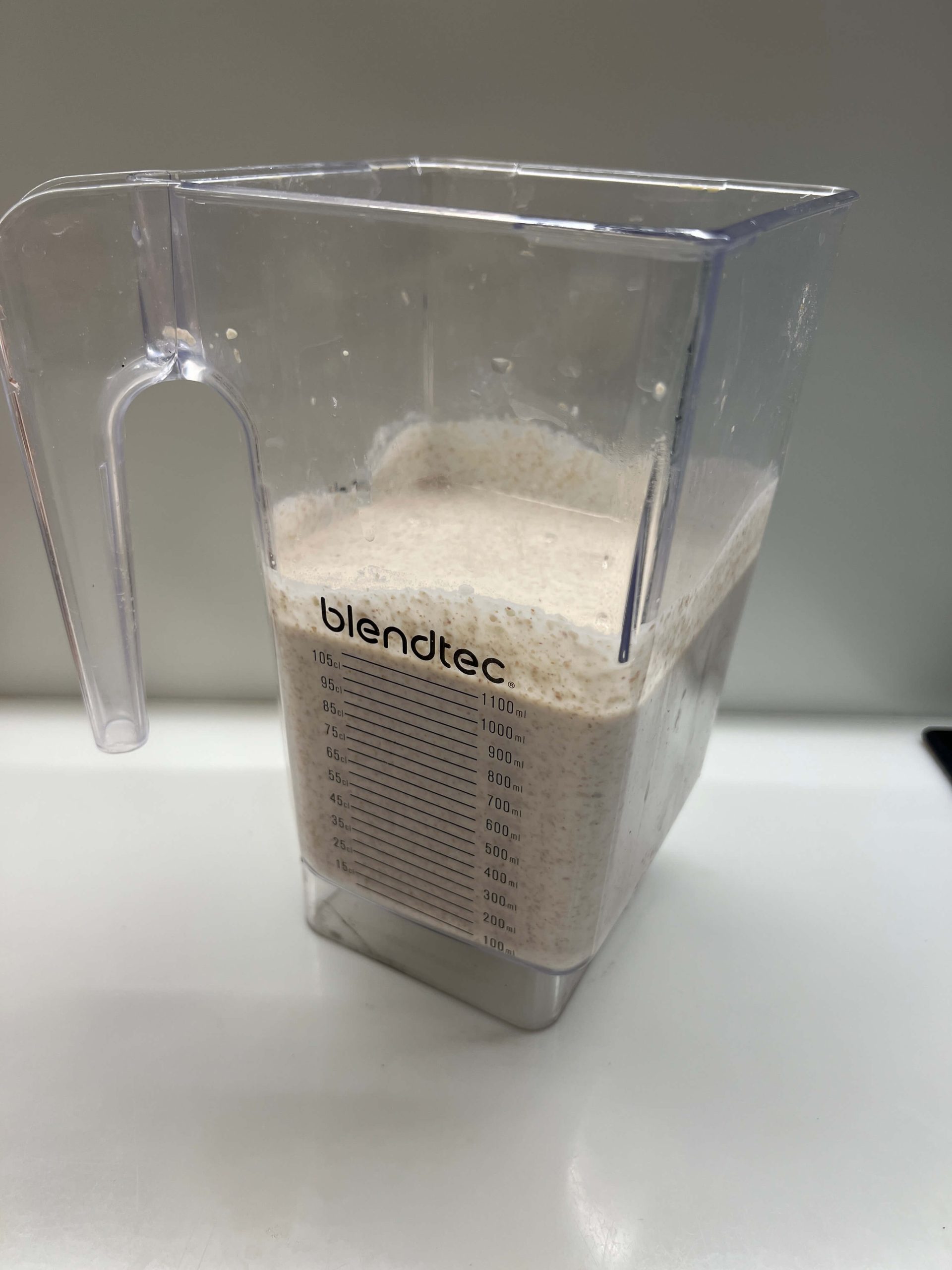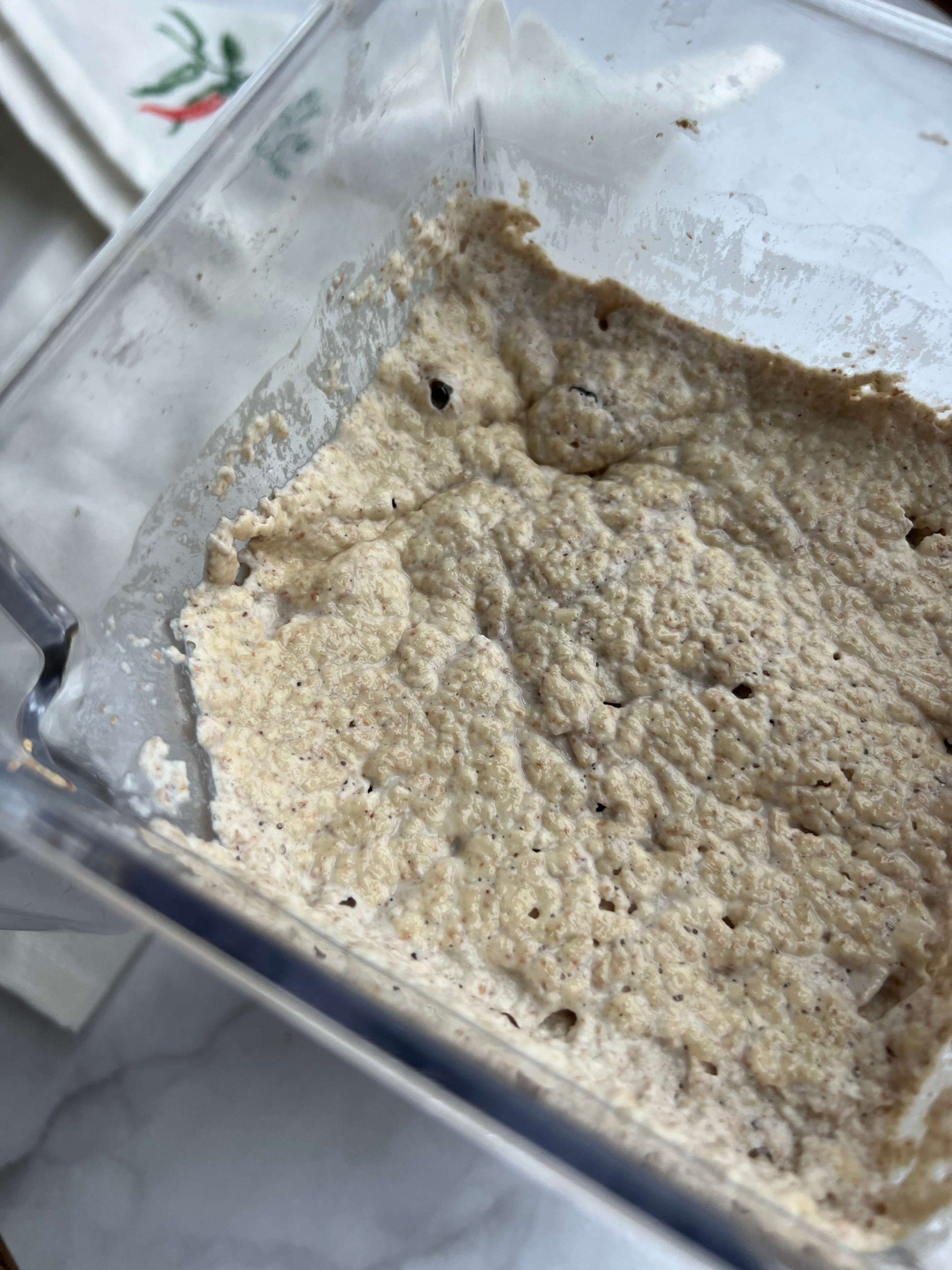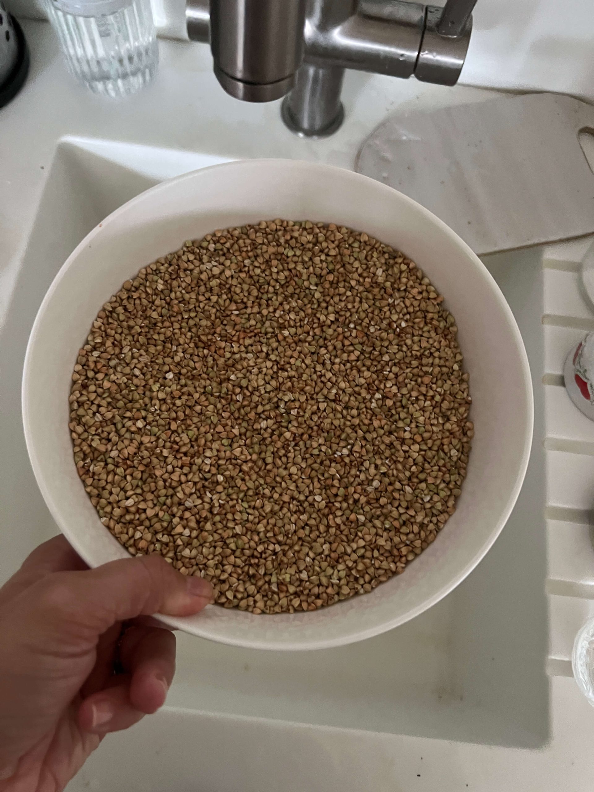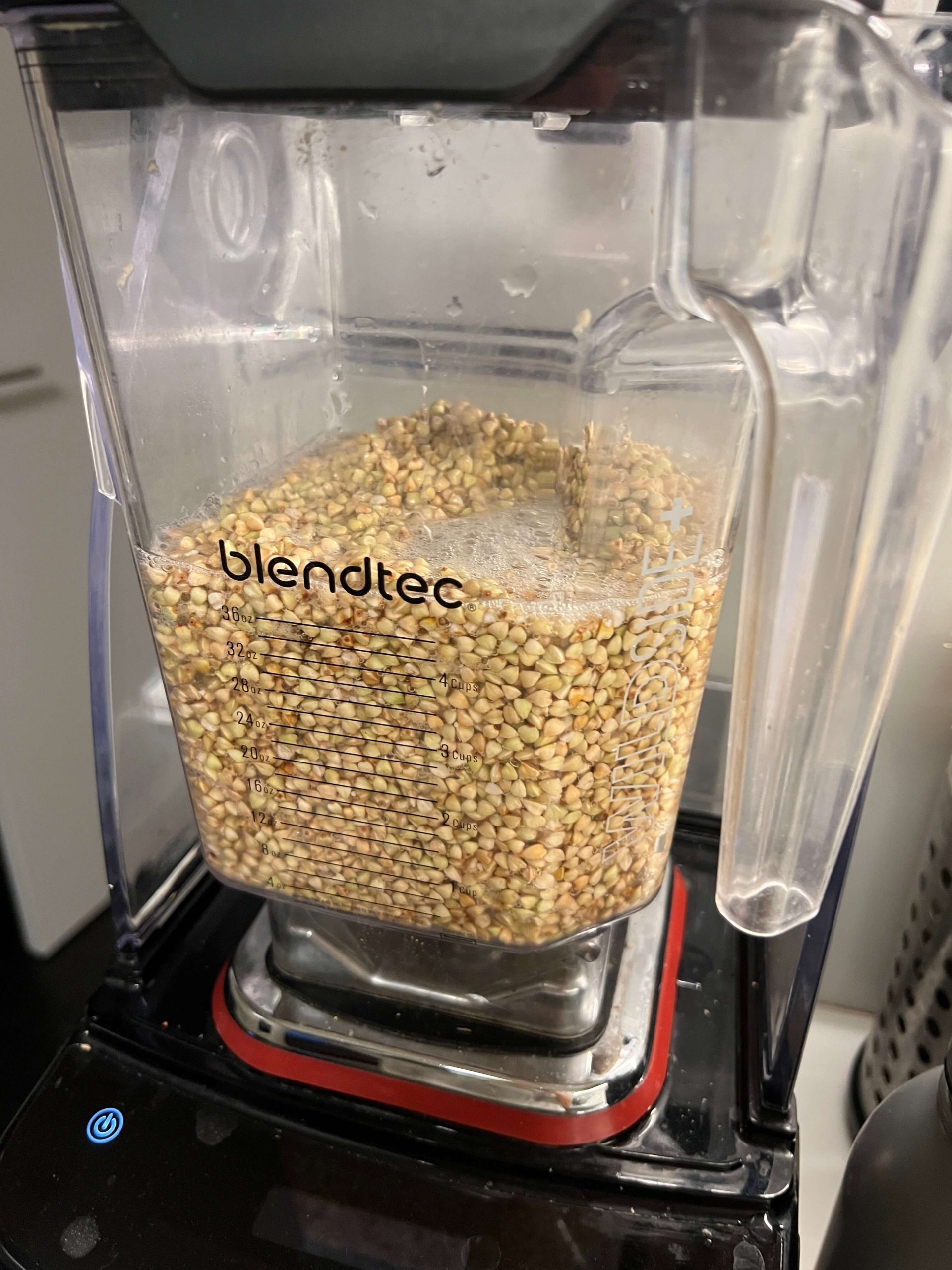 Grikius labai gerai praplauname🚰 – įpilam vandens į dubenį, rankom pamaigom ir nukošiam. Taip tris kartus. Užpilam geriamu vandeniu taip kad apsemtų ir 4-5 cm būtų virš. Udengiam rankšluosčiu ir paliekam 6val. Nupilam. NEPRAPLAUNAM. Įpilame 160-180ml vandens, dosnų žiubsnį druskos ir sublenderiuojam (jei nori “pilno grūdo” tekstūros – gali malti rupiau, jeigu vientisesnės – sumalk beveik iki košelės).